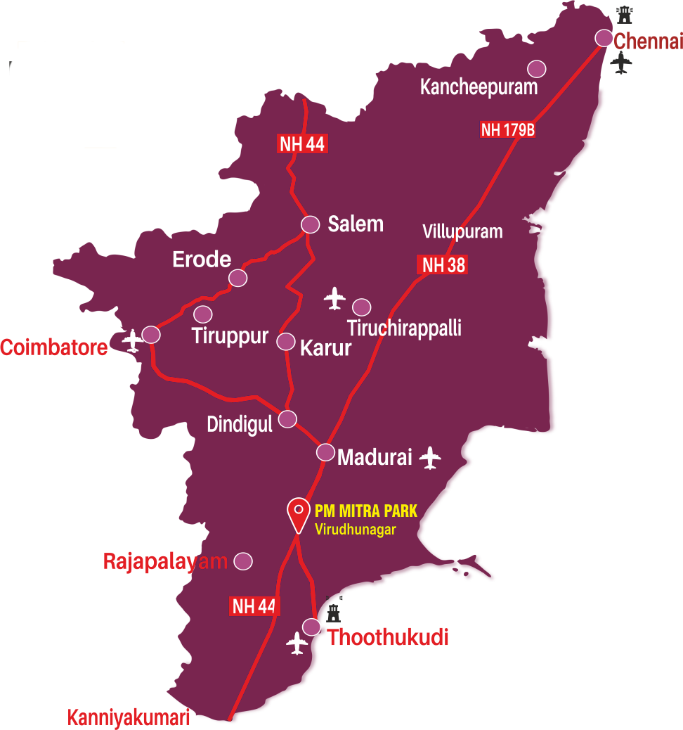 Virudhunagar, TN hosts a 1,052-acre PM MITRA Park with cotton supply, strong industry, and excellent connectivity.
